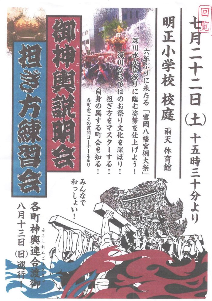 8月に開催される富岡八幡宮例大祭に向けての説明会と担ぎ方の練習会を行います。 主催:富岡八幡宮神輿総代連合会七部会